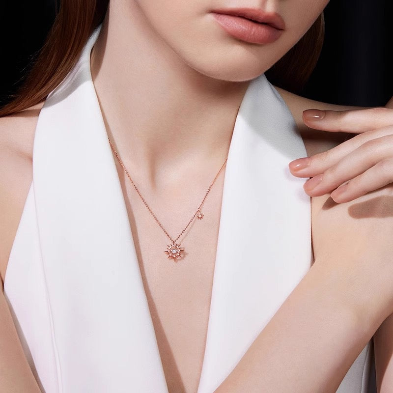 18K Gold Double Moon Star Studded Diamond Necklace