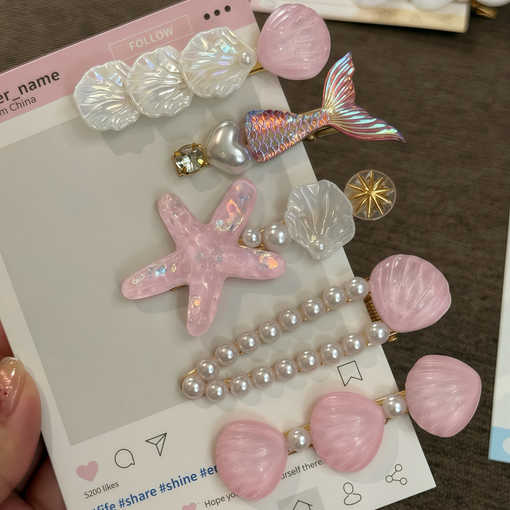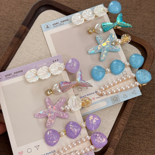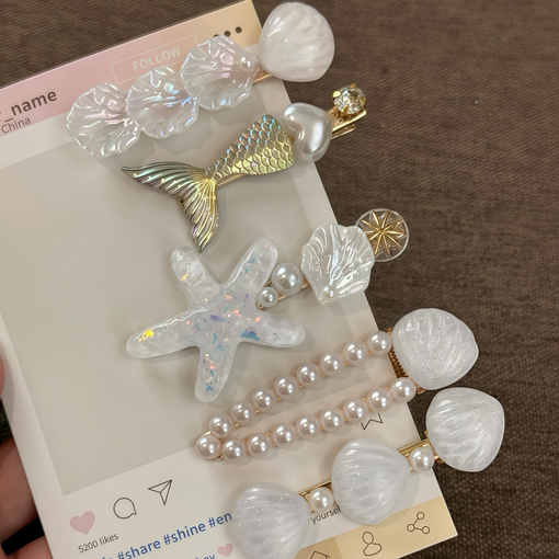 Inspired by the serene beauty of the ocean, this "Pearl Shell Starfish Tail Hair Clip Set" draws its essence from the delicate and timeless treasures found beneath the sea. The soft, iridescent glow of pearls combined with the natural elegance of seashells creates a sophisticated yet playful aesthetic. The starfish and fish tail motifs symbolize the harmony between sea creatures and their graceful movements through the water.