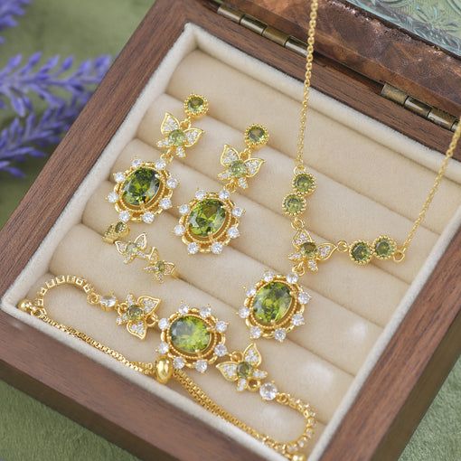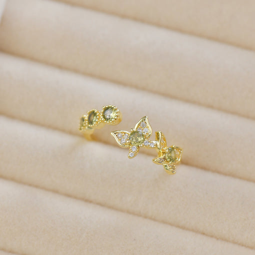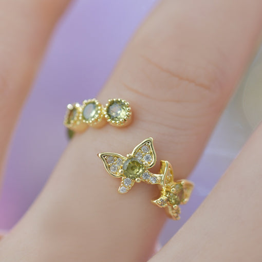 This ring captures a fleeting moment deep within the forest — where two butterflies meet and dance amidst the greenery, embodying grace, freedom, and connection. The olive-green zircon symbolizes renewal and the vitality of nature, while the twin butterfly motifs represent companionship and the soul’s quiet longing to fly. With its open-band design, the ring offers both flexibility and a sense of ongoing growth. Delicate yet meaningful, it brings the whisper of the woods and the flutter of wings to your fingertips.