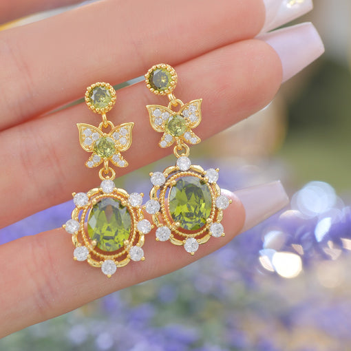 Inspired by a dream hidden deep within an enchanted forest — where butterflies dance through emerald leaves and light falls upon a waiting gem. A vivid olive-green stone anchors the piece, representing growth, serenity, and renewal. Surrounding it, brilliant white zircon sparkles like forest stardust, while two delicate butterflies flutter above, symbolizing freedom, duality, and transformation. These earrings are more than accessories — they are a whisper from the wild, a moment of magic you carry with you.